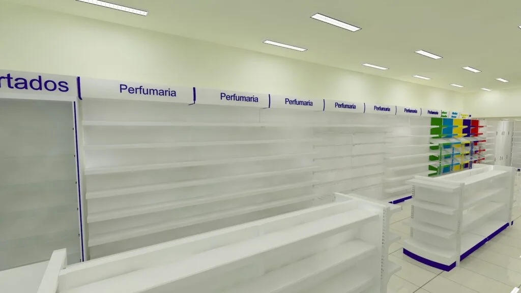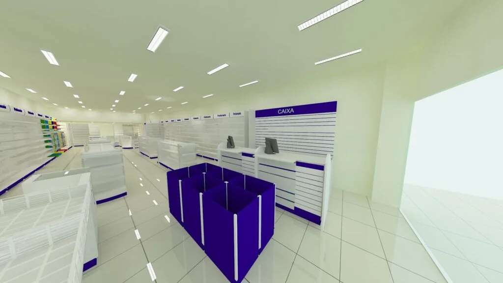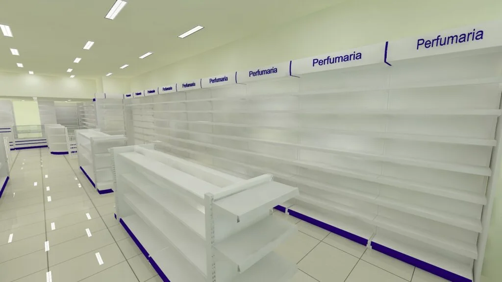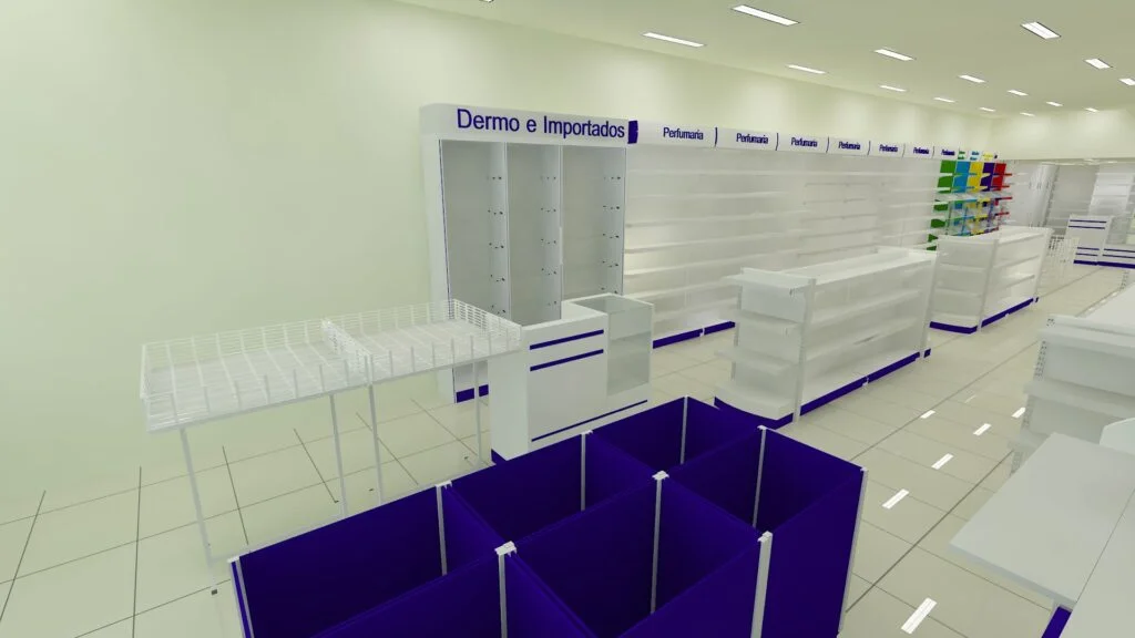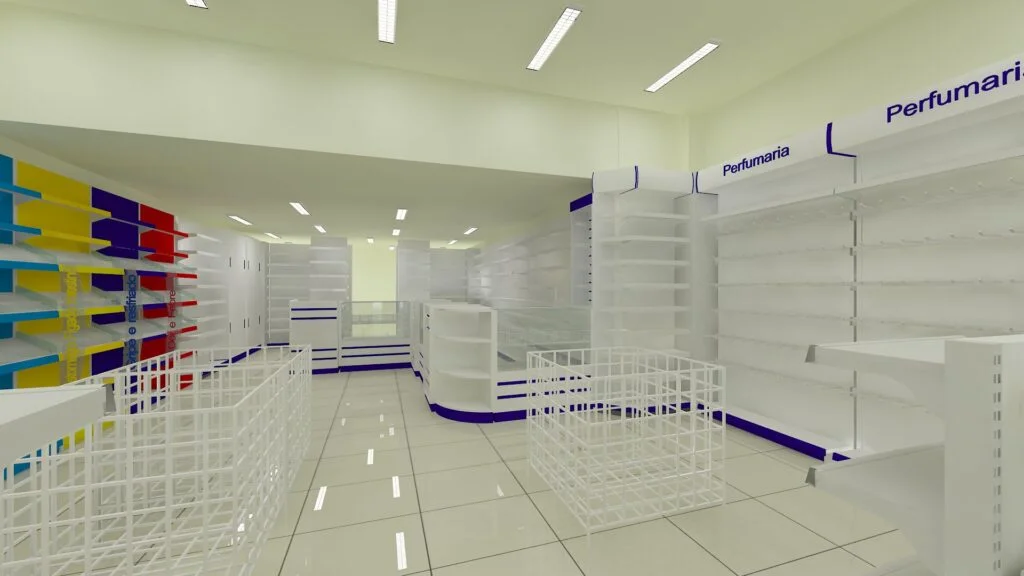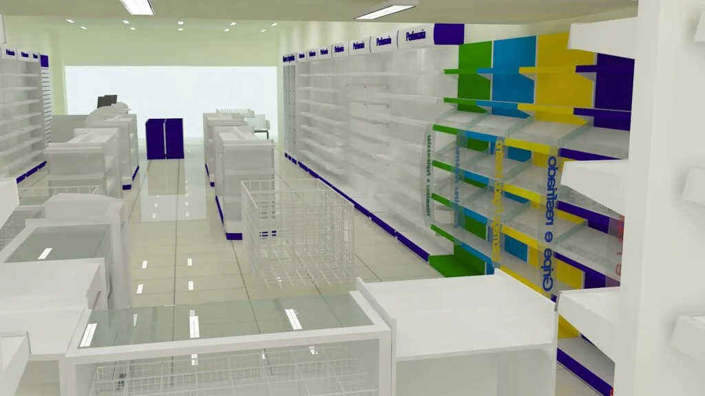 Mg industria móveis e gôndolas desenvolve projetos em 3D para farmácias e drogarias com custo zero. facilitando a visualização do seu projeto final, evitando qualquer tipo de constrangimento.